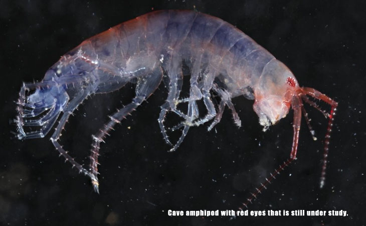 Biological methodology: Inland caves contained haloclines at 2-3 m depths, with saltwater below. The focus of the expedition was to examine these deeper waters for stygobitic fauna. Since undisturbed waters were exceptionally clear, initial collections focused on visual observation and collection. As visibility deteriorated due to being disturbed, a plankton net was used to capture smaller organisms. Finally, baited plastic bottle traps were left at depths below the halocline for approximately 24 hours to attract shrimp and other scavengers. In the lab, still and video photography were used to document coloration and swimming behavior. After photographic documentation, specimens were preserved in ethanol, RNA later, or suitable preservatives depending on their use for taxonomic, molecular or electron microscopic purposes. All material was curated for deposition in the collections of the Western Australia Museum. |