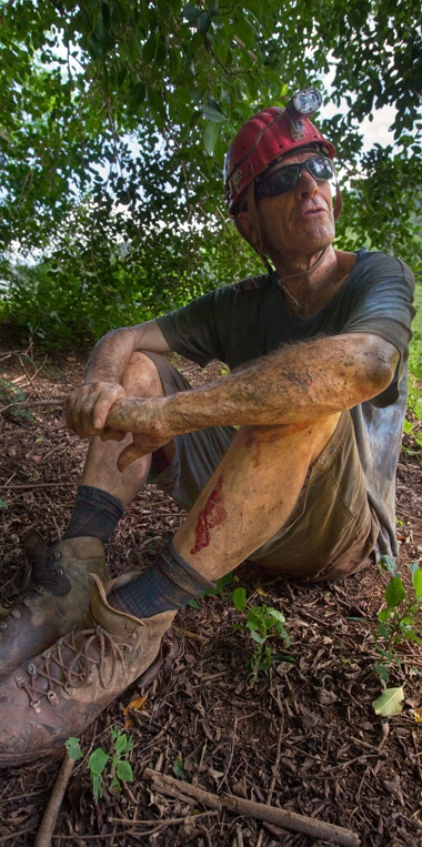 Left Photo: Bill displays his battle wounds and mud from a trip into Whip Cave. |