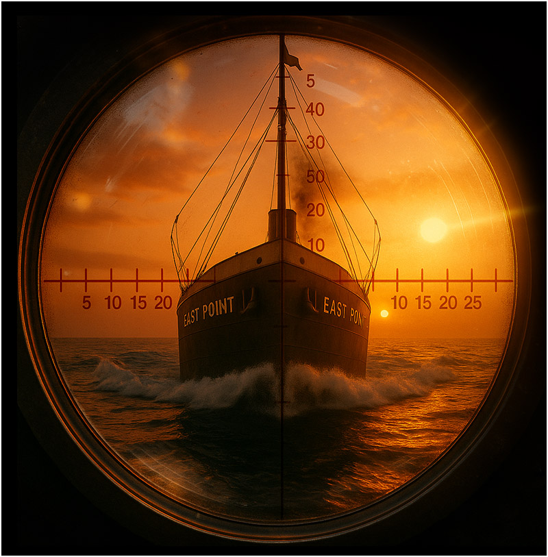 There she was — the East Point, a British tramp steamer with a black hull sitting deep in the water, her single funnel trailing thick coal smoke in the dying light. A plume of steam jetted from her whistle as she kept a steady course.