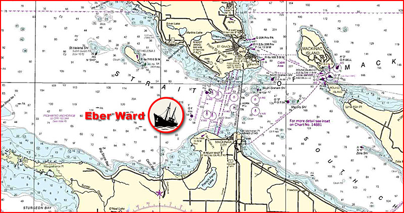Today, the Eber Ward rests upright on the bottom of the Straits of Mackinac in 147 feet of water with her decking at 120 feet, remarkably well-preserved due to the cold freshwater of Lake Michigan. The wreck is located within the boundaries of the Straits of Mackinac Shipwreck Preserve, an underwater park established to protect and promote the historical legacy of these lost vessels.