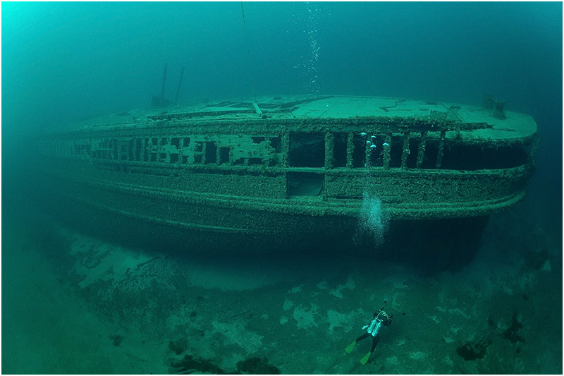 Experienced technical divers consider the wreck of the Eber Ward a premier dive site because of its depth and condition. Much of the ship’s structure remains intact, including its bow, stern, and a large section of the deckhouse. The ice crushed the bow, and divers can see the twisted metal, a silent reminder of the ship’s violent encounter.