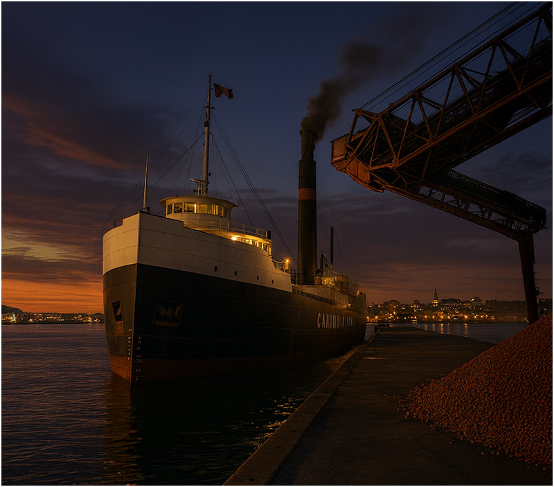 The SS Emperor lay against the Port Arthur ore dock, her iron hull pressing the fenders with a faint creak. From the chutes above, the ore poured in a constant roar, a brown torrent vanishing into her holds. The sound reverberated through the steelwork of the dock and the bones of the ship alike. A fine dust hung in the air, settling into the lines of men’s faces and the seams of their clothes.