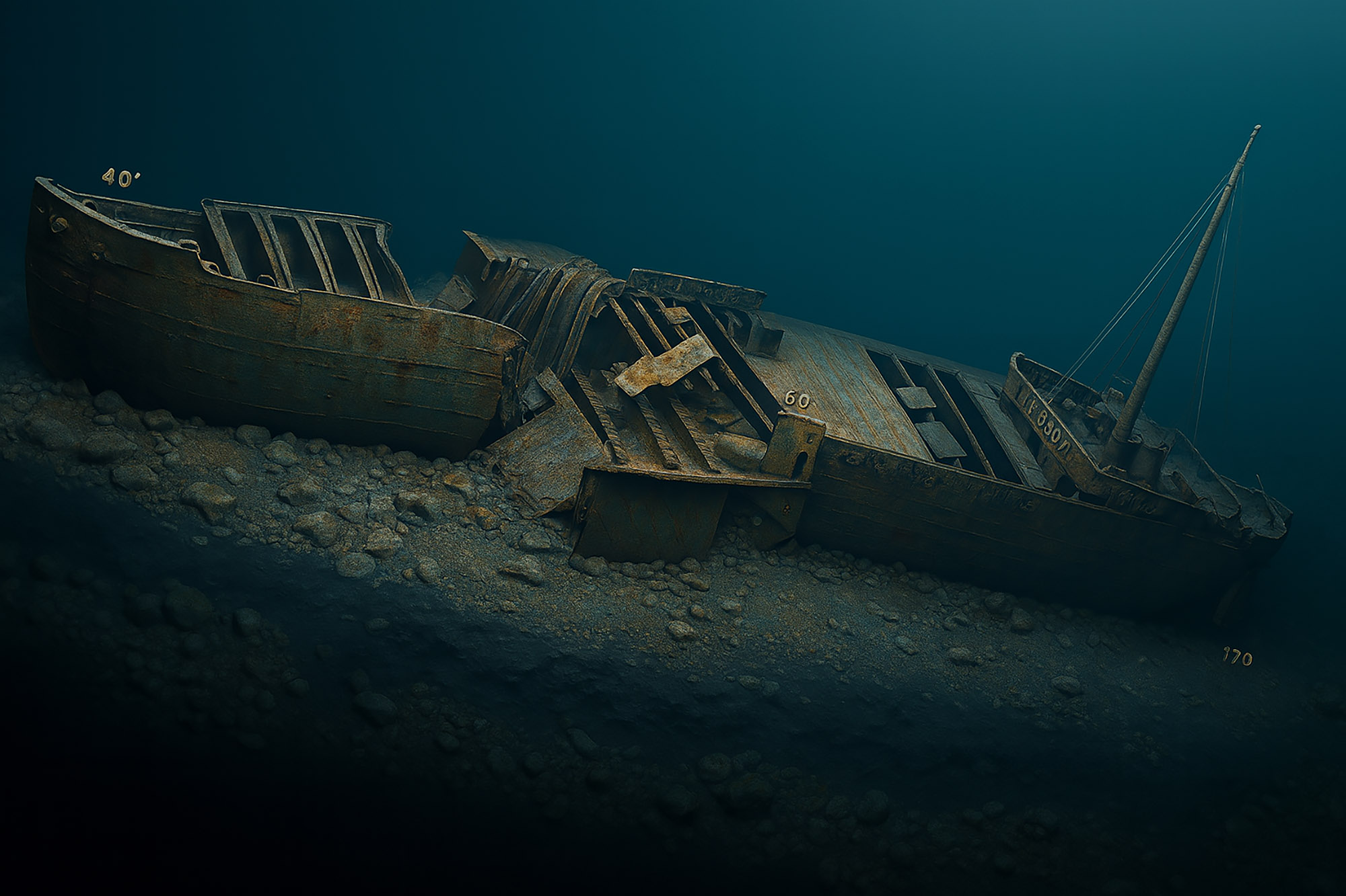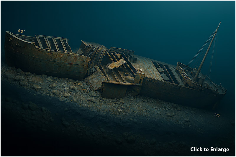 The lake claimed her by sections. The stern went first, dragged down by the weight of the ore. The rail slipped under with a hiss, then the winches, then the bitts. The bow rose briefly, water pouring from her hawse-holes in glittering streams, before she began the final plunge.