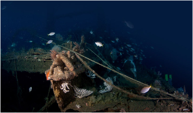 The central hold is comprised of a large open section, which backs onto a tight but open passage into the aft section. Although penetrating this section and the bow area may be possible, at only 120 feet in length, any penetration is not for the faint-hearted -- and not amenable to the amount of gear we were packing. Having been fished by locals for some years, the site is also covered in Kevlar traces which can hook you up and is very difficult to cut. For now, what lies within the hidden sections of the wreck remains a mystery.