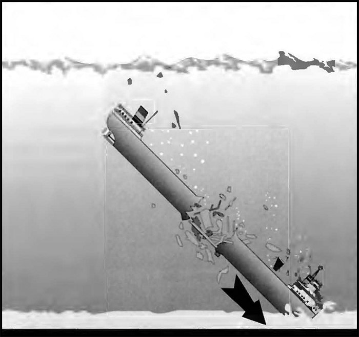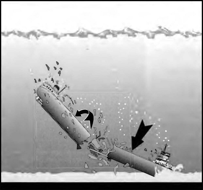 The Fitzgerald bit deeply into an especially huge wave. The bow was driven completely underwater. The weight of the flooding water, combined with the engines and forward momentum drove the vessel underwater like a torpedo. It is believed that the Fitzgerald sank in less than a minute.