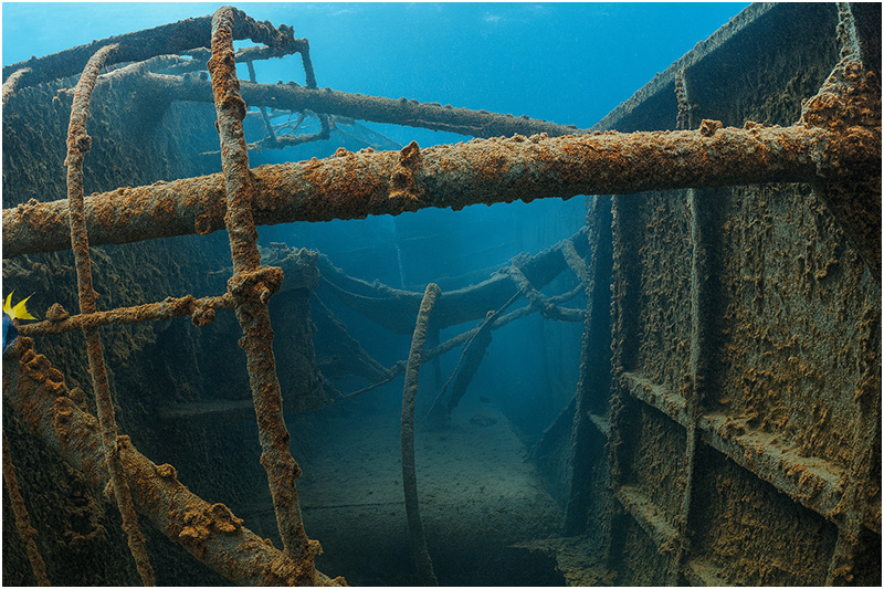Railing still adorns the perimeter of the wreck. Swimming towards the stern, numerous hatches permit access to the interior. Divers can follow rows of portholes aft until eventually encountering the large single screw on the terminus of the sloping hull. Crossing back over to the upper decks, machinery and booms provide a unique scene near the fantail, while large hawser lines float 50 feet upwards from the wreck. These lines used to float on the surface for several years, which helped to expedite the location of the wreck.