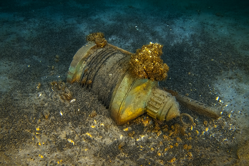 Above: Diver Keith Columbo inspecting a navigation light resting in the debris field around the James Carruthers.