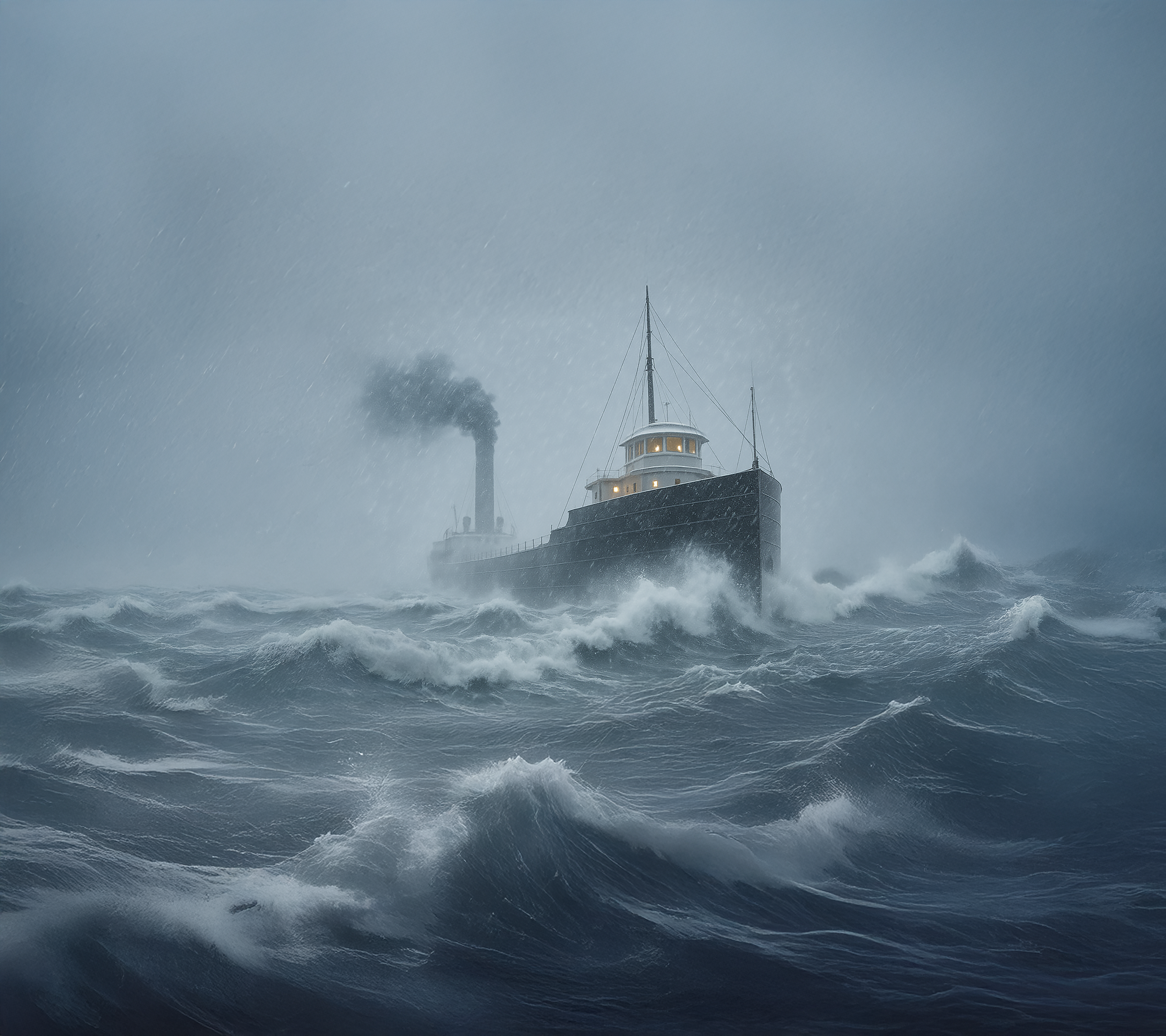 By daylight, snow squalls closed in. Lyons struggled to keep the Sheadle under control as the gale intensified. “At 5:45 p.m.,” he later wrote, “a gigantic sea mounted our stern, flooding the fantail, smashing the cabins, sweeping supper off the tables.” Torrents of water poured through skylights into the engine room; provisions were destroyed; the crew lashed themselves to stanchions to avoid being washed overboard.