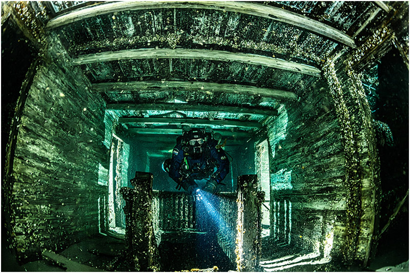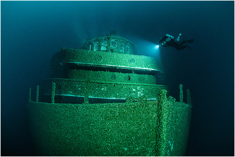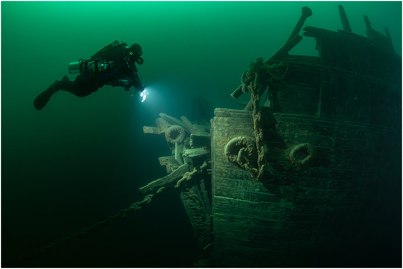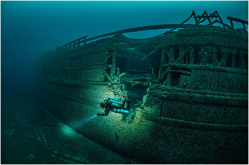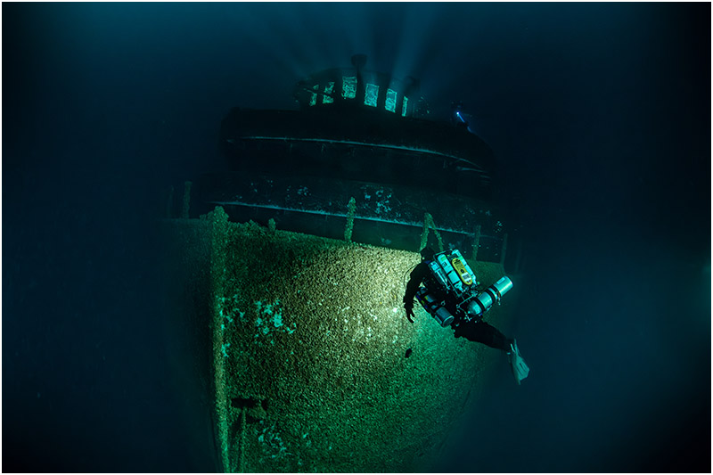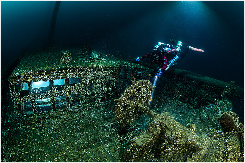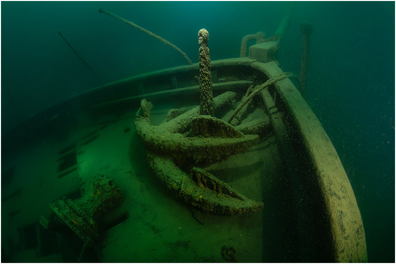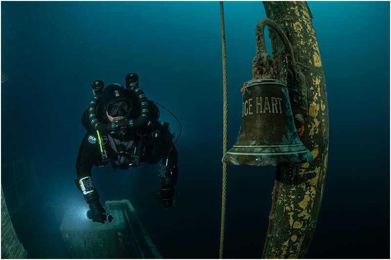 On this dive, I chose to focus on a single area, with Bob Larson lighting up the impact damage to give the scene scale. The beautifully clear waters of Lake Huron made the shot all the more rewarding—a rare treat in itself.