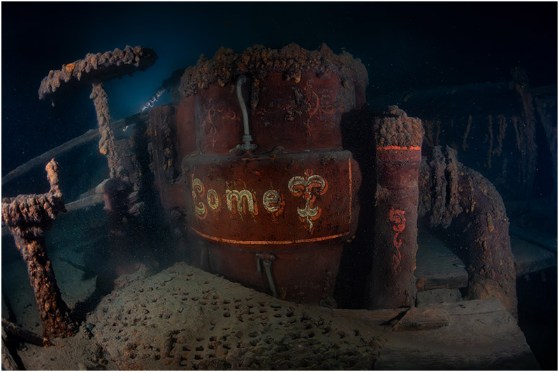 Before me emerged the Comet’s steam engine, its paintwork still vivid, its lines as crisp as the day they were laid down. The care and craftsmanship of another era remain etched here, preserved beneath the lake for more than a century. In that moment, what began as a limitation became a gift: a chance to marvel at artistry that has endured against time and water alike.
