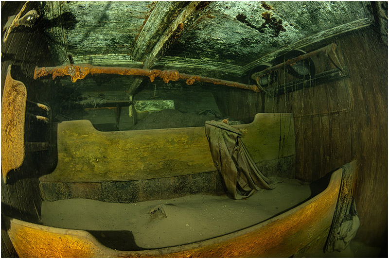 Below: Look closely, and in the upper right you’ll see a haunting detail—two bowler hats, still resting neatly on the rack, as if their owners might return at any moment. There are aspects of this photograph I might change, yet the memory of capturing it remains one of the most demanding—and rewarding—moments of my diving life.