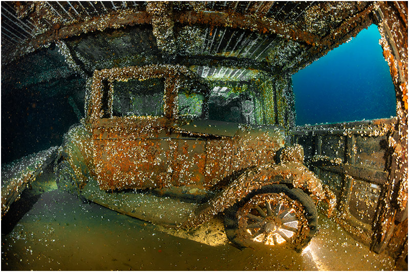 When I first heard of a shipwreck with a 1927 Chevrolet still inside, it immediately captured my imagination. Photographing it proved to be a delicate challenge—the environment both silty and fragile. Careful planning was essential, and light placement became the key. There was something deeply rewarding about looking through the viewfinder and seeing the plan come to life before me.