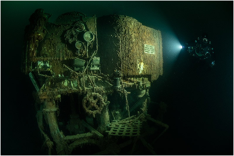 A builder’s plate, gauges, and a maze of valves offer a glimpse into the machinery that once powered these great vessels. Further off lie the remains of the bow, but reaching it requires careful navigation through the bay’s often poor visibility.