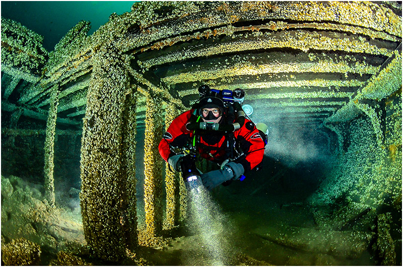 Specializing in deep wreck and cave exploration, Jeff has descended to depths to capturing high-definition stills and 8k cinematic footage that blend precise technical execution with an artist’s eye for light, composition, and storytelling. His work on the Great Lakes reveals astonishingly preserved wrecks—19th-century schooners and steel freighters alike—each documented with meticulous planning and innovative lighting to bring their history vividly to life.