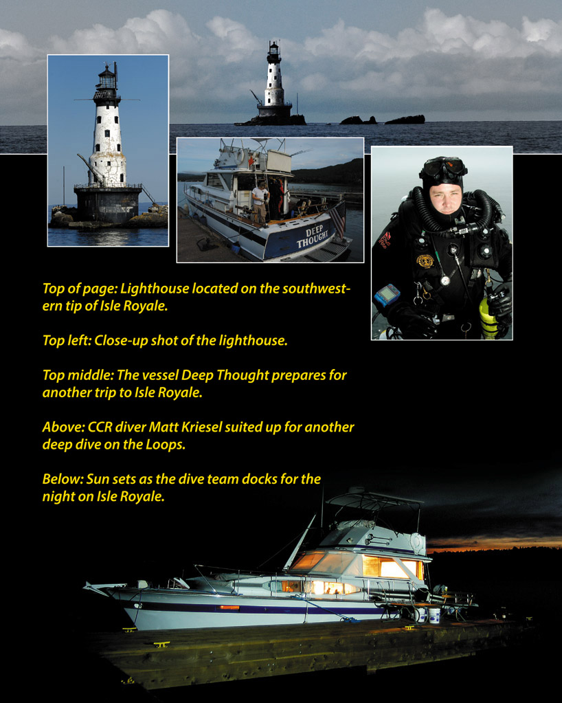 Ron and local diver Matt Kriesel picked up Mel Clark, Erik Foreman, both from the Pacific Northwest’s Seattle, Washington, area and me at the Minneapolis airport. Complete with a small trailer full of food supplies, a couple buckets of scrubber material, and about 40 small 19 cubic foot rebreather bottles containing oxygen and a diluent of trimix 15/60, our team of five divers would be set for a whole week of shallow and deep wreck exploration. Not to mention three nice-sized bottles of Crown Royal and a bottle of Parrot Bay coconut rum, my choice, to keep us warm at night on the boat. After a five-hour drive north, we found ourselves in a small Indian village with a giant casino called Grand Portage. With no time to squander at the tables, we loaded Ron’s 42-foot dive vessel, Deep Thought with supplies, rebreathers, and extra warm clothing for me. Three hours later we arrived at the State Park’s Ranger Station for a quick but mandatory check-in, a speech on how to keep the local wildlife happy, and our last look at a modern toilet and shower.