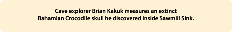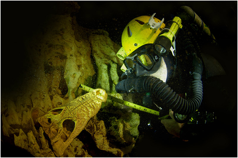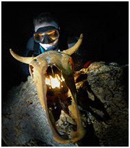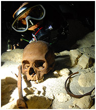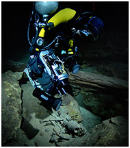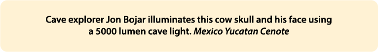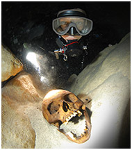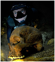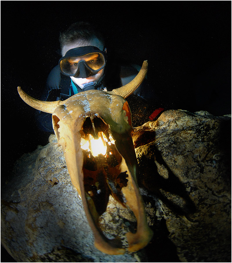 Top of Page: Brett Hemphill power snorkels into a cave to illuminate a newly discovered human skull for the author, Curt Bowen to photograph.