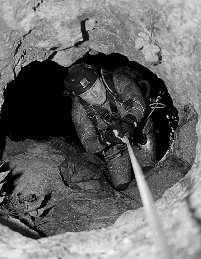 Below: The author of this editorial and publisher of Advanced Diver Magazine, Curt Bowen climbs his way back out of another Yucatan cenote.