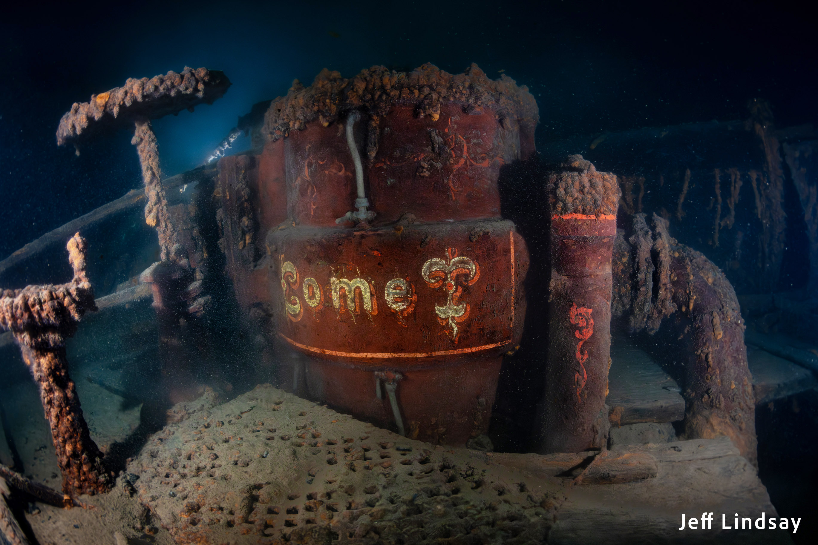 The SS Comet steam engine, a 181-foot wooden-hulled steamship launched in 1857 on the Great Lakes, began life as a hardworking cargo vessel before being adapted for passengers in 1860. Over her career, she survived collisions, groundings, and sinkings before meeting her fate on 26 August 1875, when the Canadian steamer Manitoba struck her near Whitefish Point, Lake Superior, sending her down within minutes and claiming ten lives. Known as “the only treasure ship of Lake Superior,” Comet carried 70 tons of Montana silver ore along with pig iron, copper, and wool, much of which was never recovered despite salvage attempts in 1876, 1938, and the 1980s. Though the Great Lakes Shipwreck Historical Society illegally removed artifacts in the 1980s, they are now held by the State of Michigan and displayed at the Great Lakes Shipwreck Museum. Resting in 230 feet of water within the Whitefish Point Underwater Preserve, Comet remains a haunting technical dive site—its intact hull and twin arches a reminder of the lake’s perilous and storied maritime past.