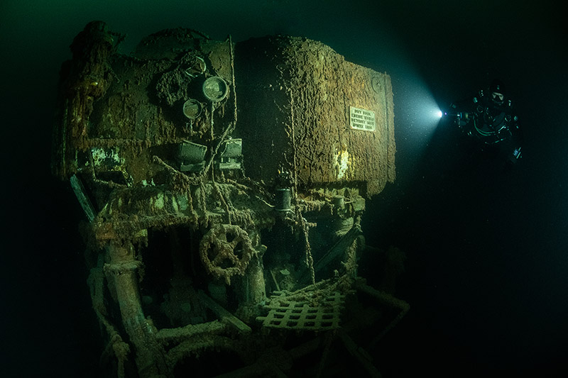 A builder’s plate, gauges, and a maze of valves offer a glimpse into the machinery that once powered these great vessels. Further off lie the remains of the bow, but reaching it requires careful navigation through the bay’s often poor visibility.