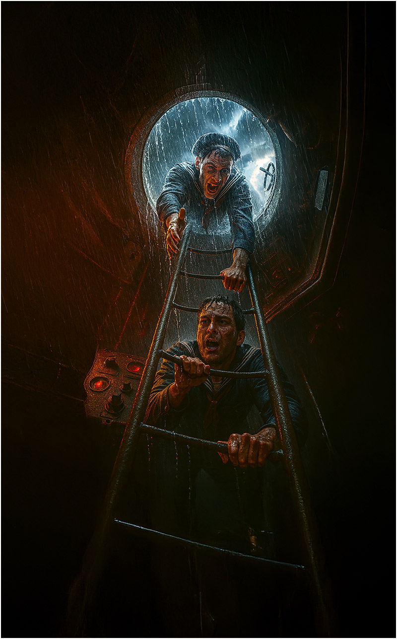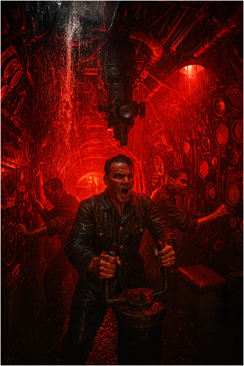The wheel turned under straining hands, metal grinding in protest. Then, with a shriek of tortured hinges, the conning tower hatch broke free. A blast of air and seawater crashed downward, flooding the compartment with a deafening roar. Men flinched, blinking against the sudden spray and the stinging cold. Faces tilted upward into that pale slit of daylight, eyes wide with a mixture of terror and desperate hope. For a moment, freedom seemed within reach.