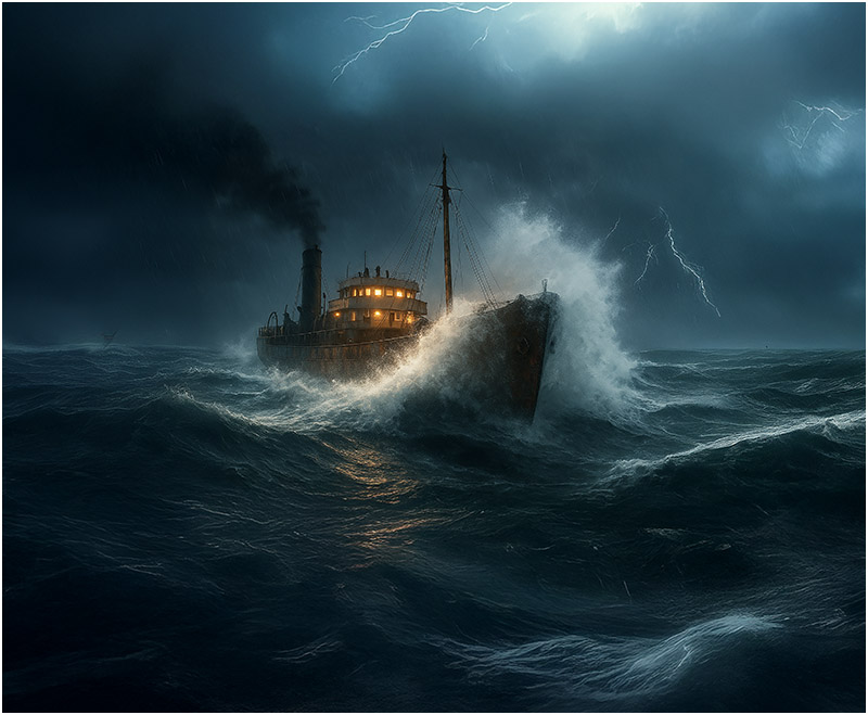 The master stormed from the wheelhouse, his oilskin whipping in the wind, face set in a scowl as he scanned the chaos of the horizon. There was nothing but storm: a world of heaving grey water and white spindrift, no masts, no smoke, no wreckage to explain the hammering blows that had jarred his ship from stem to stern. He spat seawater from his lips, shaking his head. Depth charges, he muttered — the Navy and their endless exercises, careless of merchantmen. Nothing more than that.