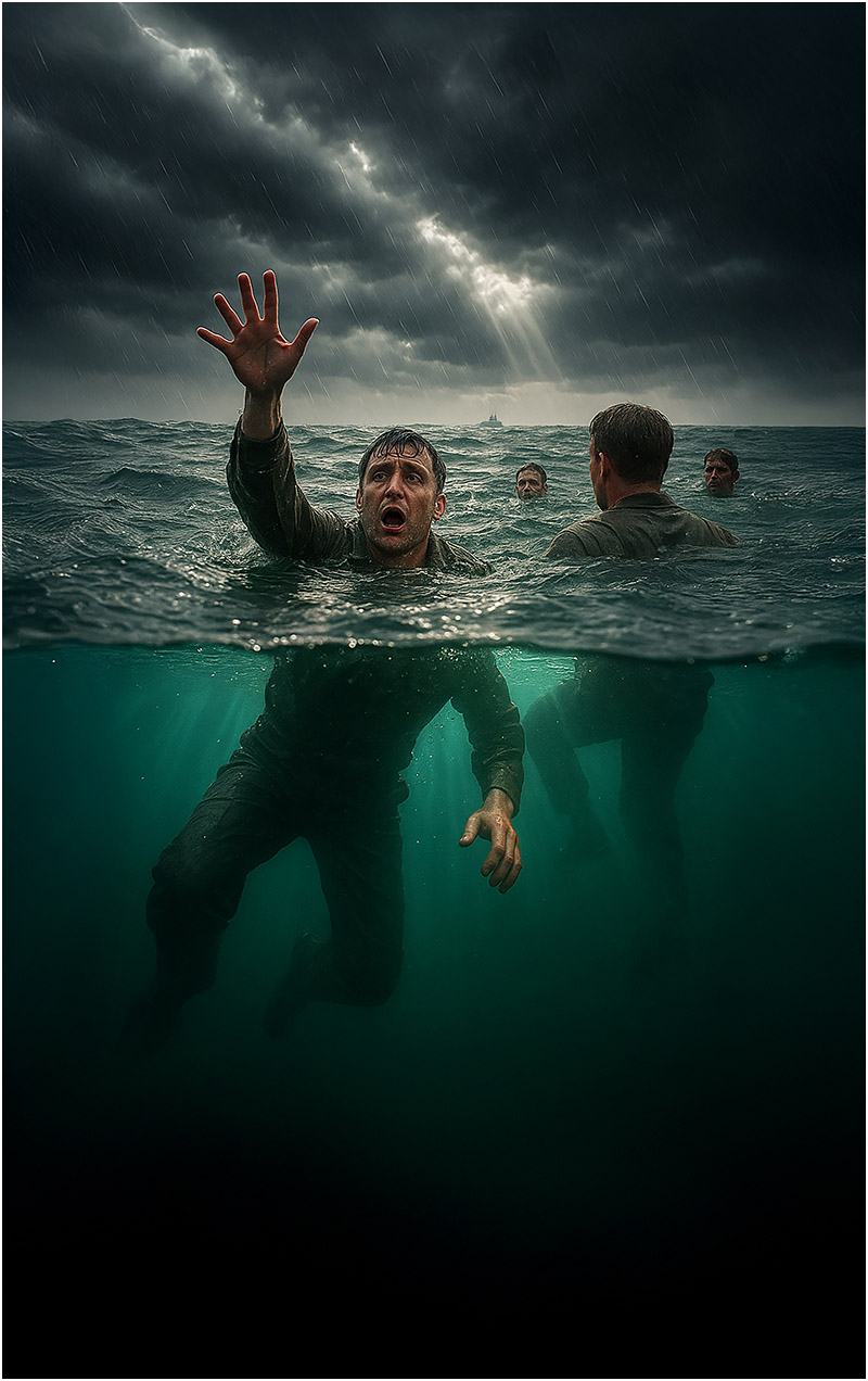 Above, the four survivors were left to the mercy of the Channel. The storm tossed them like driftwood, waves smashing over their heads, filling their mouths with salt and foam. They clung to life with raw hands, screaming into the wind, their voices ripped away before they could carry more than a few feet. Through the spindrift they saw the collier Vidar, a smudge of black against the grey horizon, its stern lifting and falling as it pulled away into mist. They waved, shouted, begged to be seen. But no one turned. No one came.