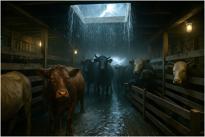 In the holds below, chaos boiled. Cattle shifted restlessly, their hooves splashing in the rising water, the pens shuddering under the force of their panic. Suddenly, without warning, the mass of beasts surged to one side—whether driven by water lapping at their legs or the terrifying crack of thunder and lightning splitting the sky overhead.