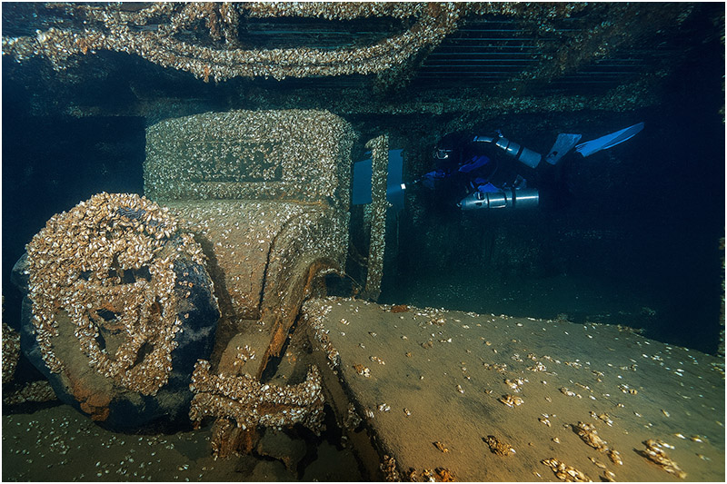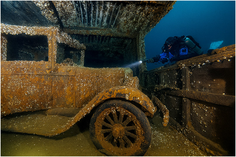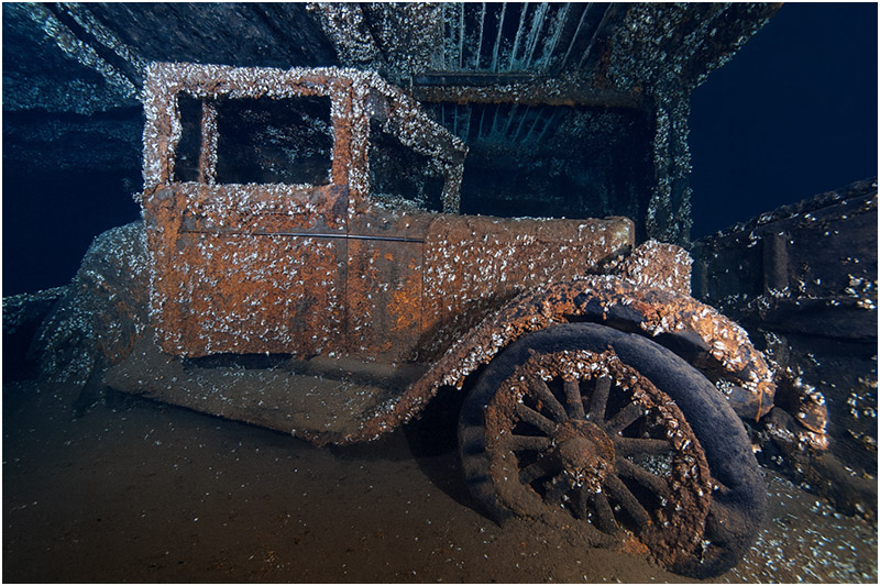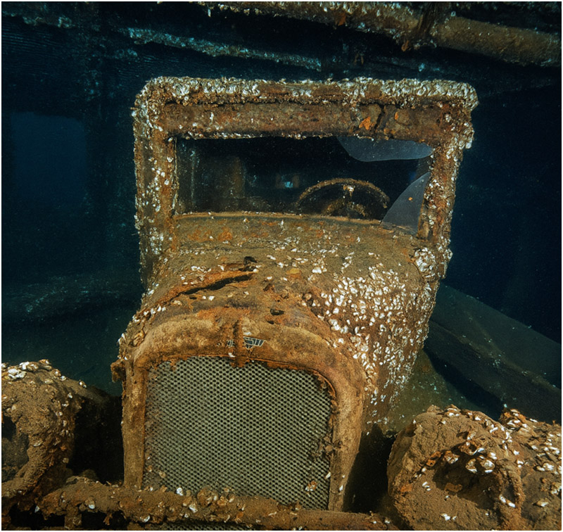 Another notable feature of the wreck is an intact 1927 Chevy coupe, owned by passenger Don Wallace. The car sits upright and is easily viewed from the cargo hold without having to penetrate the wreck. It’s reminiscent of Truk Lagoon—only a bit colder. Wallace, who also owned the cattle, was the only passenger to survive, along with Captain John McKay and three other sailors.
