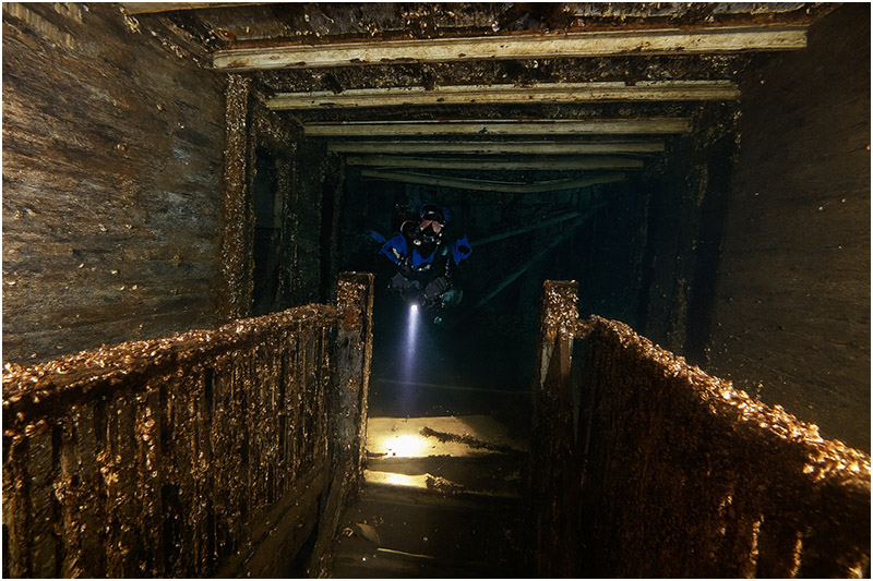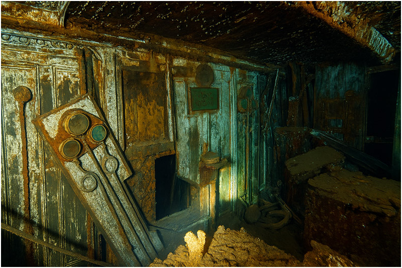 Inside the wreck, white paint still adheres to the walls as you move forward past passenger staterooms down to the engine room and cargo hold. Light bulbs and hanging chandeliers remain in place. Beyond the engine room, moving forward, you’ll encounter the remains of cattle bones and preserved carcasses.