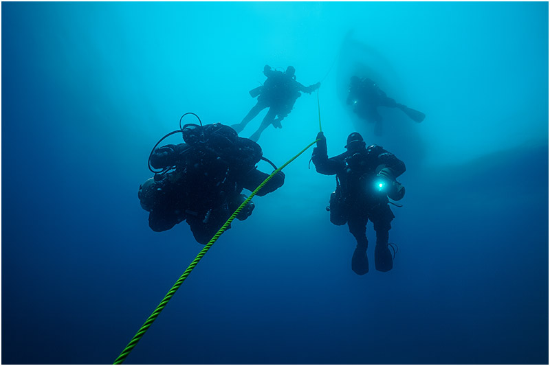 As with most deeper Great Lakes wrecks, the bottom temperature is a brisk 39°F (4°C). However, Lake Huron’s thermocline can be surprisingly warm depending on the time of year. Most of our decompression stops above 70 ft were spent in balmy 65°F water. In addition, the water is usually crystal clear, with visibility of 50–100 ft (15–30 m) not uncommon.