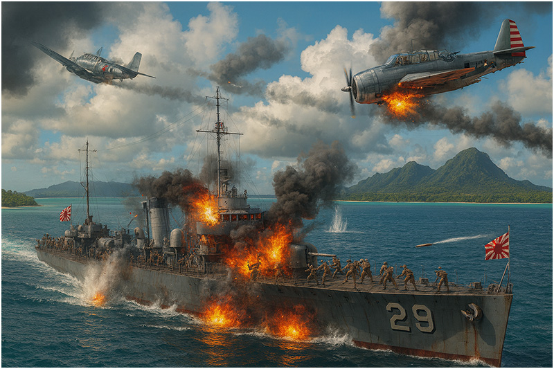 As Truk was now well under attack, Oite, being considerably faster, reached Truk well before the subchaser and entered the Lagoon before new orders were directed from island command. Despite now receiving orders to head back for Saipan, the captain of the Oite had already taken his vessel through the North Pass of Truk Lagoon, where Operation Hailstone was now well advanced. Soon after an exchange of information—and possibly due to it—the Oite came under heavy fire from US fighters. The first wave of attacks took out the command post, the commander himself, and the entire bridge. The second attack wave of five Avenger planes struck the Oite with a torpedo, which blew her in two, sinking her immediately. Of the 589 men on board, only 20 survived.