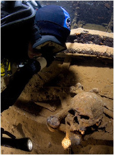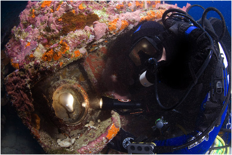 On reaching the bow, the open break allows a diver to venture within and examine the interesting upturned interior of the hull with many working mechanisms and machinery to be seen. It is inside this section of the wreck that more human remains can be seen, as well as personal artifacts and broken fans that would have kept the tightly packed rooms of sailors cool in the Pacific heat. In addition to this, broken china tea cups, plates and saucers. A second torpedo may have struck the bow section, as there is a large hole on the starboard side and an even bigger exit-type hole on the opposite side!