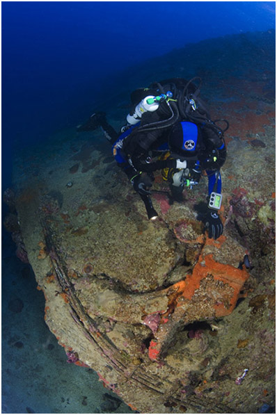 The Oite is a poignant reminder of just what happened at Truk Lagoon, and human remains can clearly be seen around the wreck. The extended stern deckhouse, which separates two guns—the AA and the battery gun—has doors on either side where the diver can peer within to see the accommodation area. Close to here, my diving partner Gabrielle Paparo from Italy discovered and pointed out to me the location of the ship's bell stowed within a storeroom. This bell was previously discovered by divers in 1998. As this feature is written, it is still unclear if this bell belongs to the Oite herself or that of the cruiser Agano, which may have been removed before the vessel finally sank. The bell is encrusted in 65 years of marine growth, and her name is not visible. Of course, Truk being an underwater museum—not to mention a grave for hundreds of Japanese sailors—nothing is touched, and artifacts like ship's bells are left in place. In other locations around the world and on vessels that do not fall under a grave status, a ship's bell such as that discovered on the Oite would, of course, be a major trophy for any wreck diver.