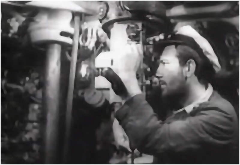 A faint rumble of a ship’s engines off in the darkness reaches the U-124 crew as they sit motionless on the submarine’s deck, ears straining for any man made noise. “All below deck,” commands the Commander. Sliding quickly down the ladder, the last crewman closes the sub’s hatch, locking it tightly closed. “Dive 10 meters, up periscope,” the Commander orders as he pulls down the handles and stares into the scope.