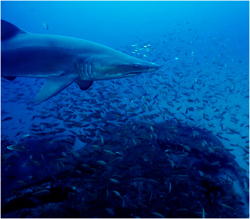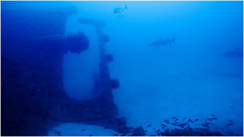 Swimming towards the stern, there is a large hole leading into the engine room area where closer inspection you can see a boiler, broken catwalks, engine pipes, and the drive shaft along with schools of Jack’s darting in and out of the twisted steal. Rounding the stern, the rudder post rises thirty feet above the sand. The rudder itself has fallen off the post along with the now missing prop, obviously salvaged for its value in brass. Scanning off the stern across the flat sand, a large sandbar shark moves in to investigate why I’m not making any bubble sounds. Even for a large predator, the shark shy away as I attempt to move in closer for better footage.