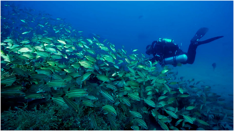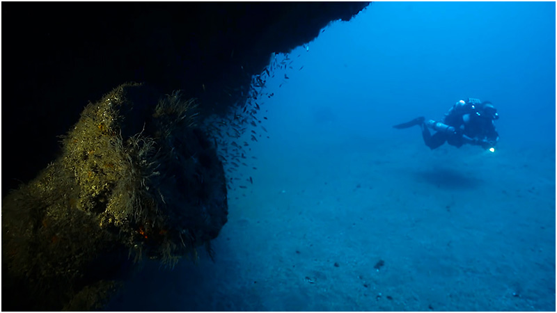 Returning to the Papoose, I find another large hole in the hull just about midship. Adjusting the brightness on my dual Big Blue 24,000 lumen video light to full power, I squeeze through an opening and into the wreckage. Once inside, I find myself in a very large upside down space with lots of old pipes, broken metal and thousands of fish. Several holes in the structure allow light to beam in from the outside as the large schools of fish circle in and out of the darkness.