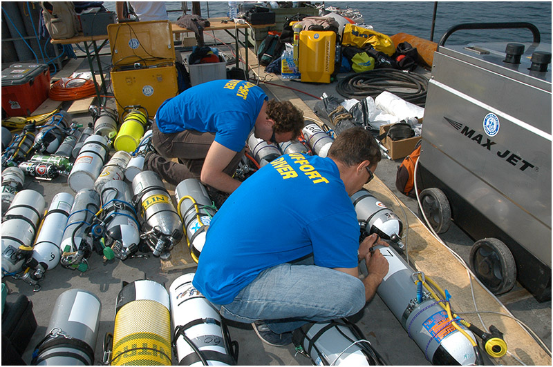 Is such a dive feasible? What are the risks? I played with a special version of GAP and with V-planner (dive planing software). I generated some diving and decompression schedules. The outcomes didn’t make me thrilled… long runtimes… high CNS percentages…. Then Mario came up with a dive plan (generated with V-planner B/E conservatism +4) taking into account Open Circuit decompression in a diving bell. Starting at 21 meters on EAN50 and from 12 meters on pure oxygen, generating a total CNS of 23,000%. It would take the bottom divers about 3 hours from the bottom to reach the bell. The deco in the bell would take another 4 to 5 hours. There was room for four divers in the bell, so the team invited also Alessandro Scuotto and Cedric Verdier to take part.