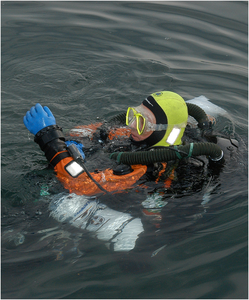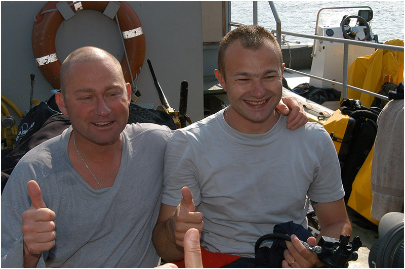 Remko accompanied me to the bell. Together with another shallow support diver, he took off my Ouroboros. I could barely move. I was trying to get into the bell, but almost every power has left my body. Only when Remko signaled that the other divers needed to enter the bell, I could push myself inside. In the bell, I opened the oxygen valves and put on a breathing mask. I felt very dizzy and had to vomit once. Ten minutes later, Alessandro and Mario were entering the bell. Alessandro was not in a good shape and he vomited frequently. Every thirty minutes we did our air breaks and after a while the bell moved up to the next deco level. After almost five hours, I was going to be the first diver to exit the bell. I putted on a rec BCD with Full Face Mask. Two fire department divers guided me to the surface. There, a large crowd was waiting for me. Surface support laid me down on the warm deck of the vessel. My wet suit was removed, and a medic checked my blood pressure and did some “sanity” tests. I was feeling pretty dizzy and getting up on my feet was difficult. I was wrapped up in an aluminum blanket to prevent the loss of body heat. Cameras were clicking and zooming. TV teams from Italy, Russia, US and South-Africa were filming the entire event. With a couple of minutes interval, Alessandro and Mario emerged. Alessandro was taken care of immediately by the medics. In spite of his physical condition, he was smiling and waving to the crowd. He was put on transportation to the nearest decompression chamber. Mario and I gave some interviews and posed for pictures. Slowly, the people were leaving the vessel and the pontoon. Mario and I were transported back to the harbor… We had a lot to talk about, but we saved it for later. It took me another two days before my dizziness had disappeared completely.