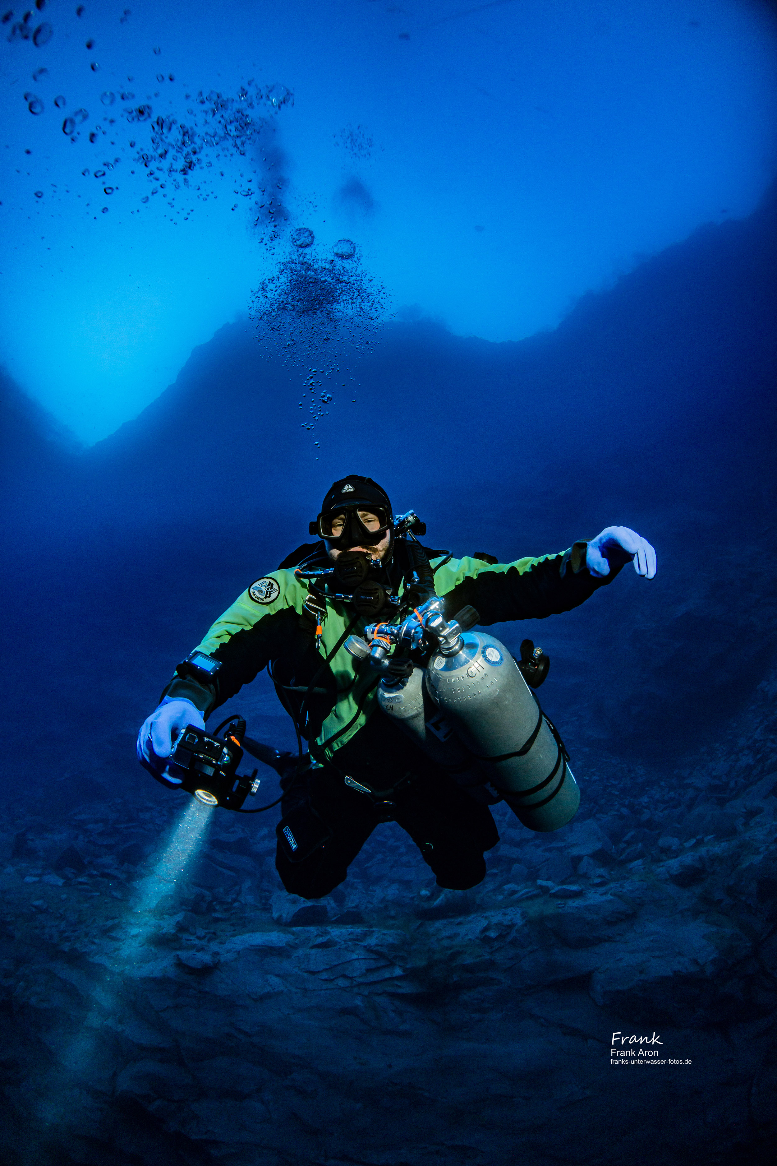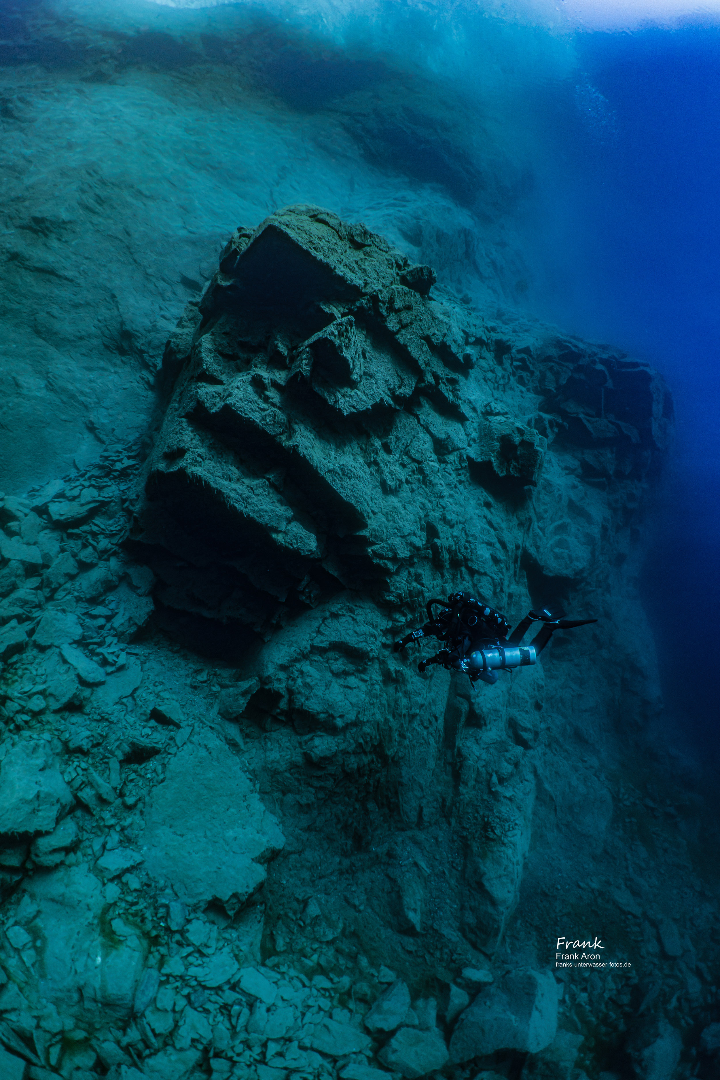 Visibilities in the winter time can easily exceed 100 ft / 30 meters. Once under water, the walls drop sharply to a maximum depth of 130 feet / 40 meters. Divers feel like being in the blue Caribbean sea, the only difference is the water temperature is only 40 degrees F / 4C. The owners of the quarry have installed large training dive platforms at 20ft / 6m - 30ft / 9m and 90ft /28m.