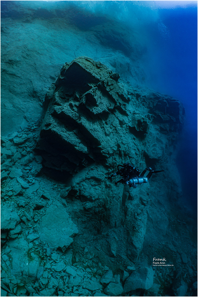 You gain the most beautiful impression of the mountain lake by diving onto your back and looking up at the surface. On sunny days, a bundle of sunbeams crests the hills, illuminating the entire scene. Because of the fantastic visibility, one can see above water structures on the hillsides, even from a depth of 130 feet / 40 meters. Only heavy rainfalls affect the conditions in the quarry.