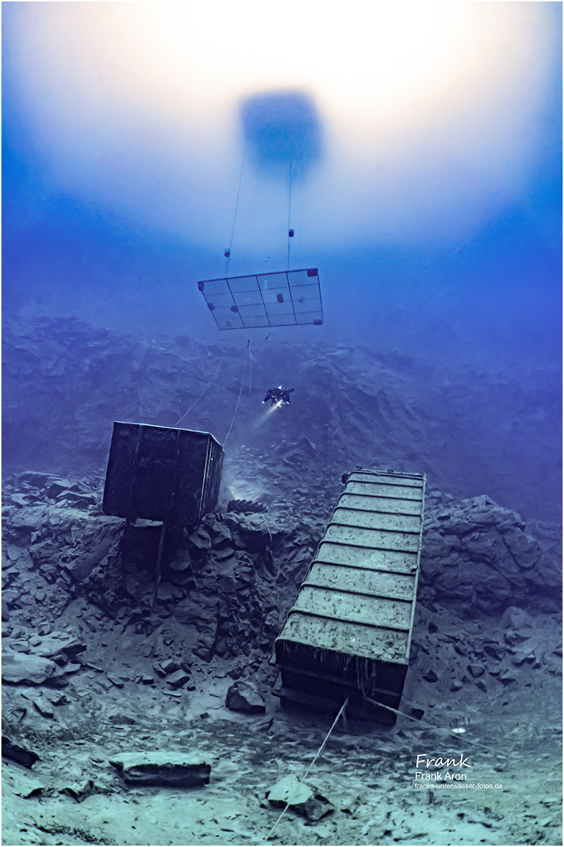 When reaching 130ft / 40m, the visibility is so good you can often see over half of the bottom of the quarry. Divers in the past have sunk multiple items in the quarry, such as large box containers, round concrete tubes and a few small boats. The big prize sunk in the lake is a real German military ship. After departing the deep region, you ascend past some old cars, such as a “Trabant”, the former “Volkswagen” of the German Democratic Republic and a mannequin dressed in a German GDR military outfit.