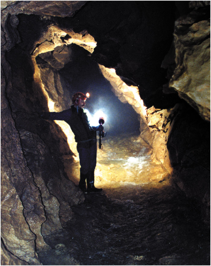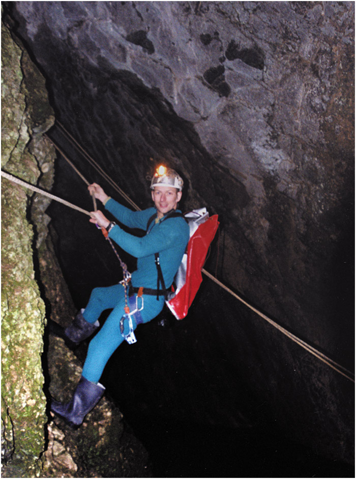 The entrance to the cave was reached by following two water pipes 10K/6.21 miles along the river then up an inlet through the forest. The water pipes take water from the lake in the cave entrance to the town and were installed by German POWs in World War II. The cave entrance is situated at the base of a large cliff behind a 50m/165ft high waterfall. To reach the first sump, four separate SRT pitches were rigged and a tension wire haul line and pulley for the gear. These pitches and haul line got the team the first 100m/320ft into the cave and up the inner 30m/100ft high waterfall. The stream passage had to be followed for a further 200m/656ft to sump 1.