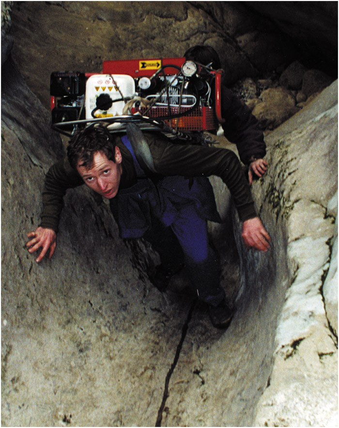 It took four days of rigging, hauling, and carrying to get the gear to sump 1. We then did a recognisance dive. Sump I can be followed in rapidly descending passage to a depth of 30m/100ft where the entire water flow issues from a low, wide slot only 15cm/6 inches high just beyond the elbow of the sump. Looking into this slot, the passage can be seen to ascend and enlarge to the limit of visibility. Further back at 14m/45ft, a sideline leaves the main water flow and passes through boulders to surface in a small muddy pool at the base of an ascending vertical rift. This continuation leads up via 30m/100ft of easy free climbing to a 50m/164ft hands and knees crawl and a large boulder floored chamber. From the chamber, a very unstable 45-degree boulder slope must be descended using a rope and descender to a small and very uninviting pool of brown water, which is sump 2.