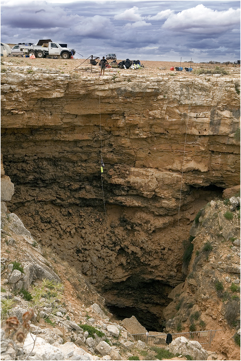 Looking at the entrance to Cocklebiddy, it’s obvious to see that this cave, as with many of the caves on the Nullabour, is nothing but a surface collapse at one point in the cave’s length. Basically, the cave created below, at some point in time, became too large to support the rock that remained above and hence collapsed in on itself, opening up the cave as we know it now. There is a theory that there is a southern passage, but no one has yet found a way into it, therefore the explorers of today concentrate on exploration upstream. The cave was formed some ten million years ago, and it’s only due to the fact that at one point in its length a collapse occurred that we are aware of its existence. Quite possibly, there are other caves under the Nullabour that are even bigger than Cocklebiddy that we are just unaware of because they simply have not collapsed.