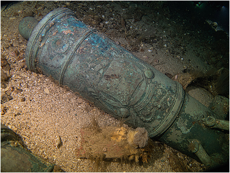 The shipwreck lies over 100 kilometers beyond UK territorial waters in 255 feet of water, far from the traditionally assumed site near the Casquets. To investigate, the UK Ministry of Defence authorized Odyssey Marine Exploration to confirm the wreck’s identity by surveying the site and recovering two bronze cannons.