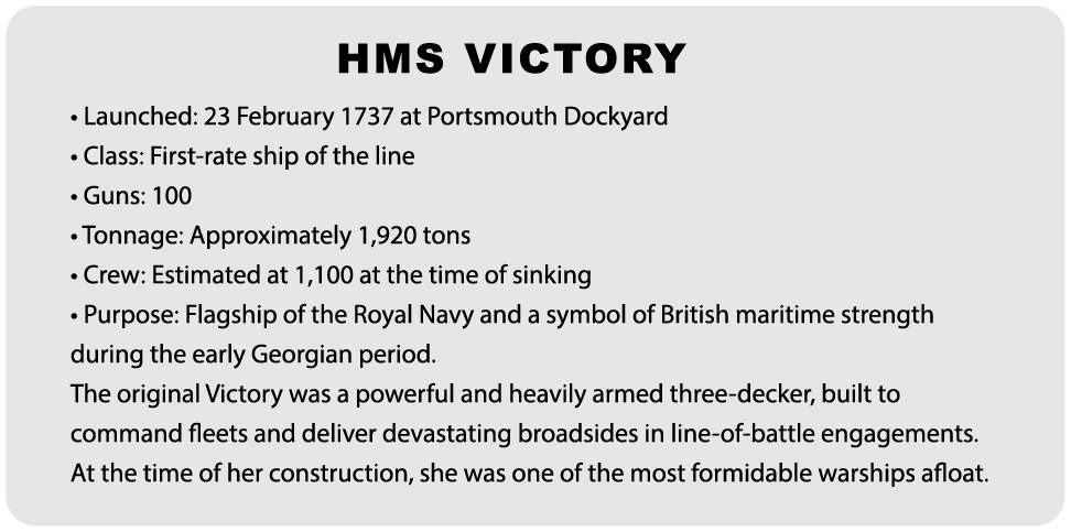 Wreckage washed ashore in the days that followed—timbers, casks, splinters of gun carriage, a coat-button bearing the Admiralty anchor, and a nameboard: Victory. But no man was saved from that cruel sea.